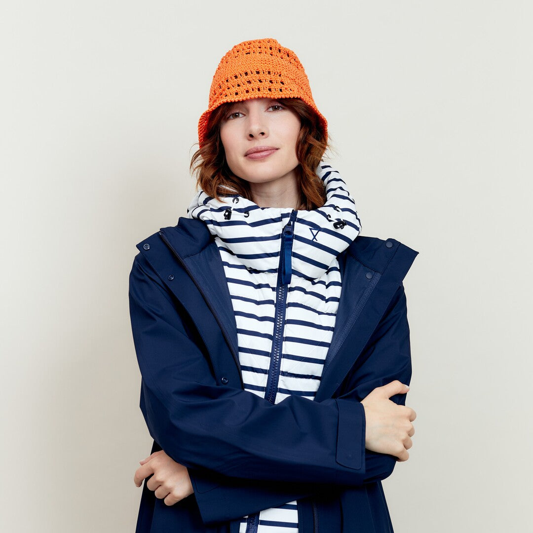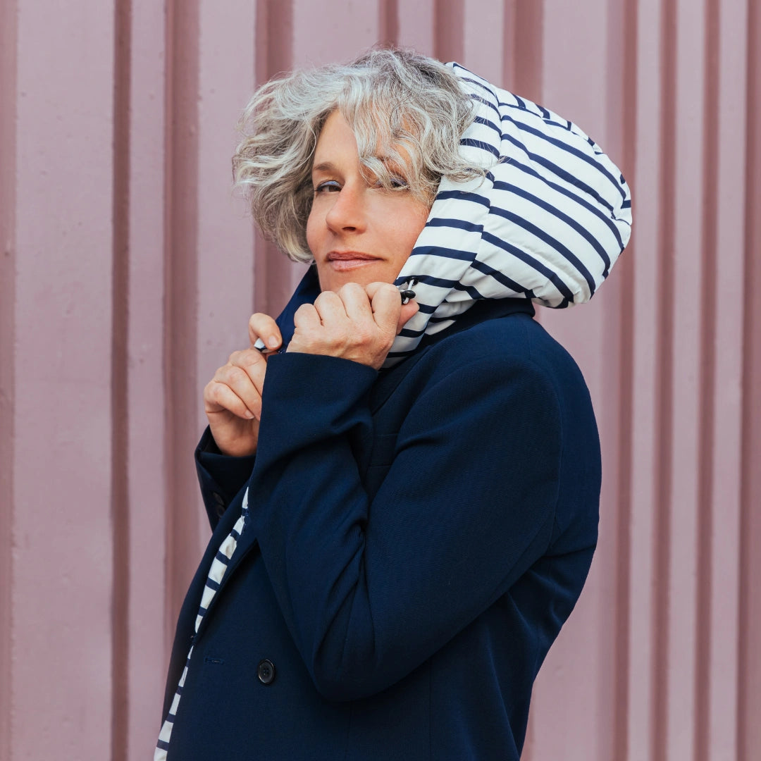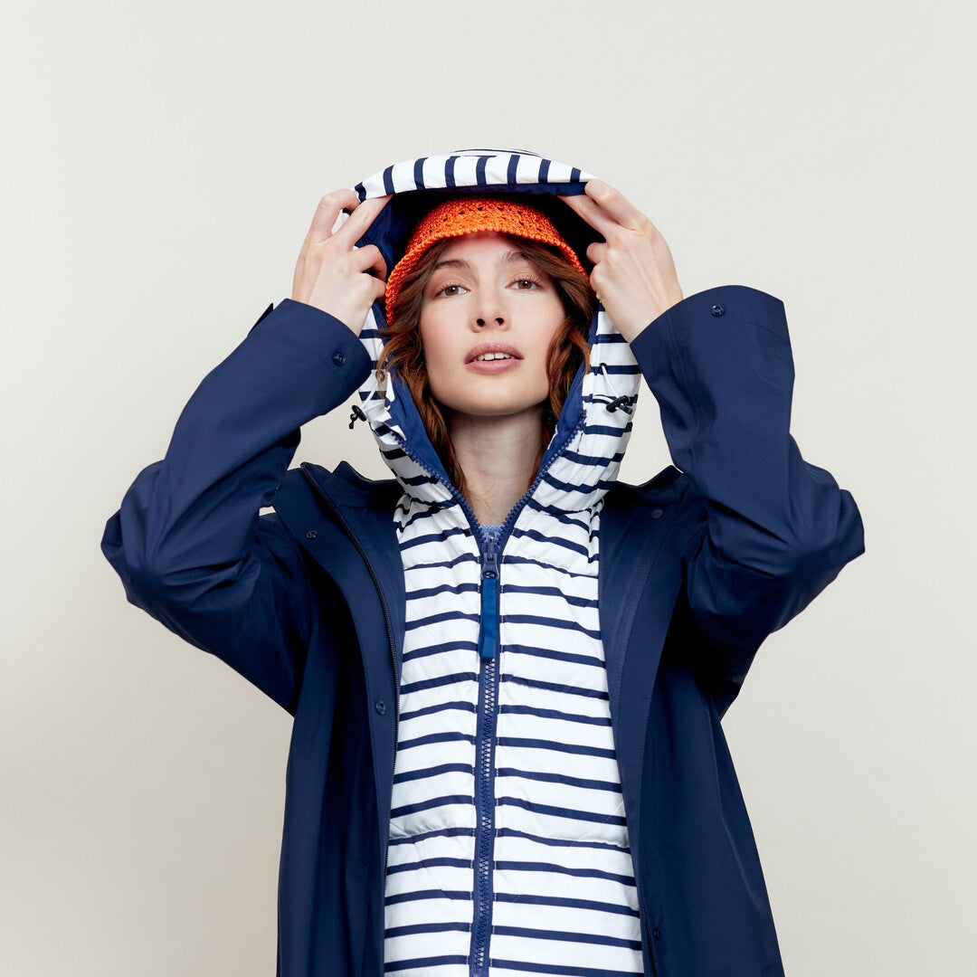 Capuche doudoune à rayures bleu marine et blanc