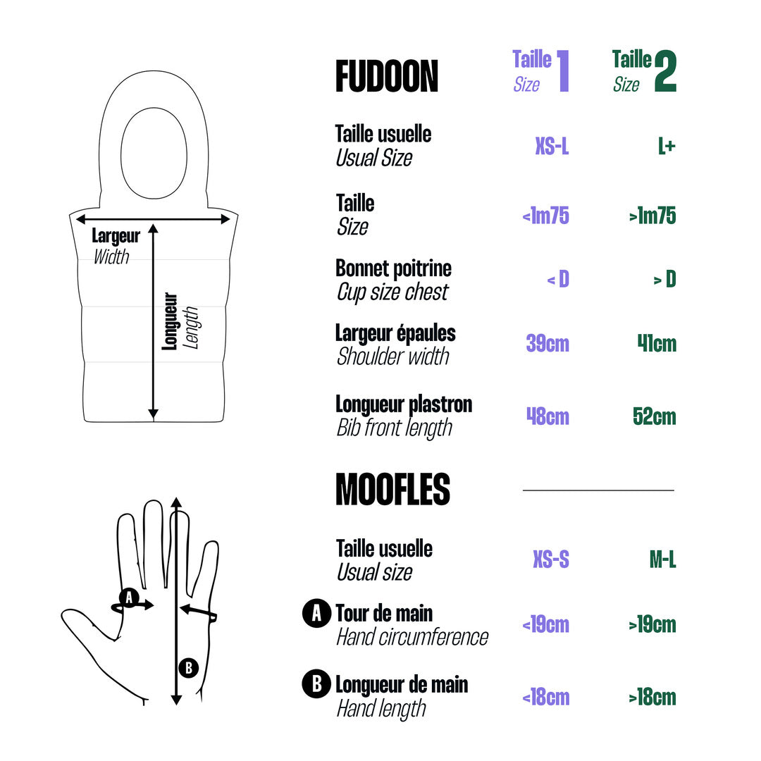 Fudoon est proposée en taille 1 standard dans tous les coloris. Pour celles et ceux qui portent du L et + habituellement en haut / veste ou souhaitent être plus couvert.e.s, nous proposons certains modèles en taille 2 également.