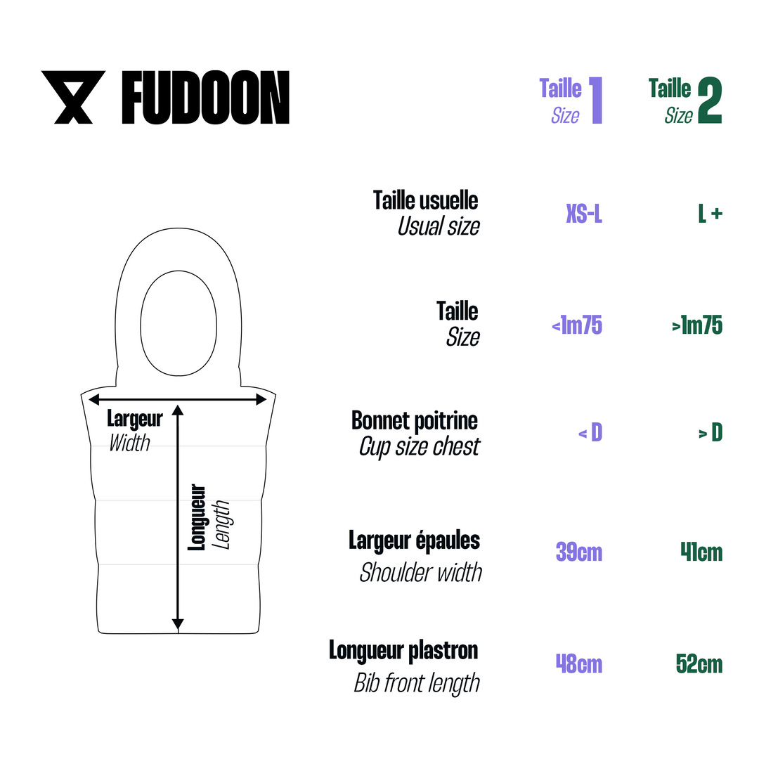 Fudoon est proposée en taille 1 standard dans tous les coloris. Pour celles et ceux qui portent du L et + habituellement en haut / veste ou souhaitent être plus couvert.e.s, nous proposons certains modèles en taille 2 également.